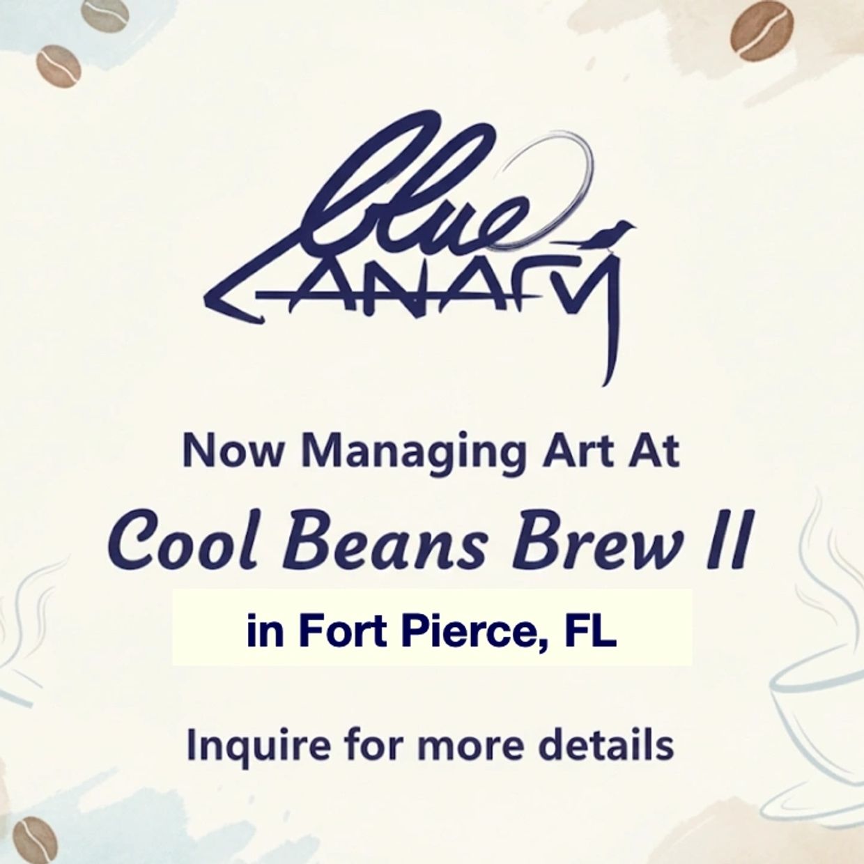 Currently, Blue Canary Agency is managing the art at Cool Beans Brew II by way of invitation from the local arts school who owns the business, The Lindsay School of the Arts. The Agency is in charge of curating the space, overseeing the artists and running the Peacock Arts Festival. Located at 1115 Delaware Ave. Ft. Pierce FL, 34950 come see what we have on display. Support local art! IF YOU WISH TO BE CONSIDERED FOR DISPLAY, PLEASE CONTACT US.